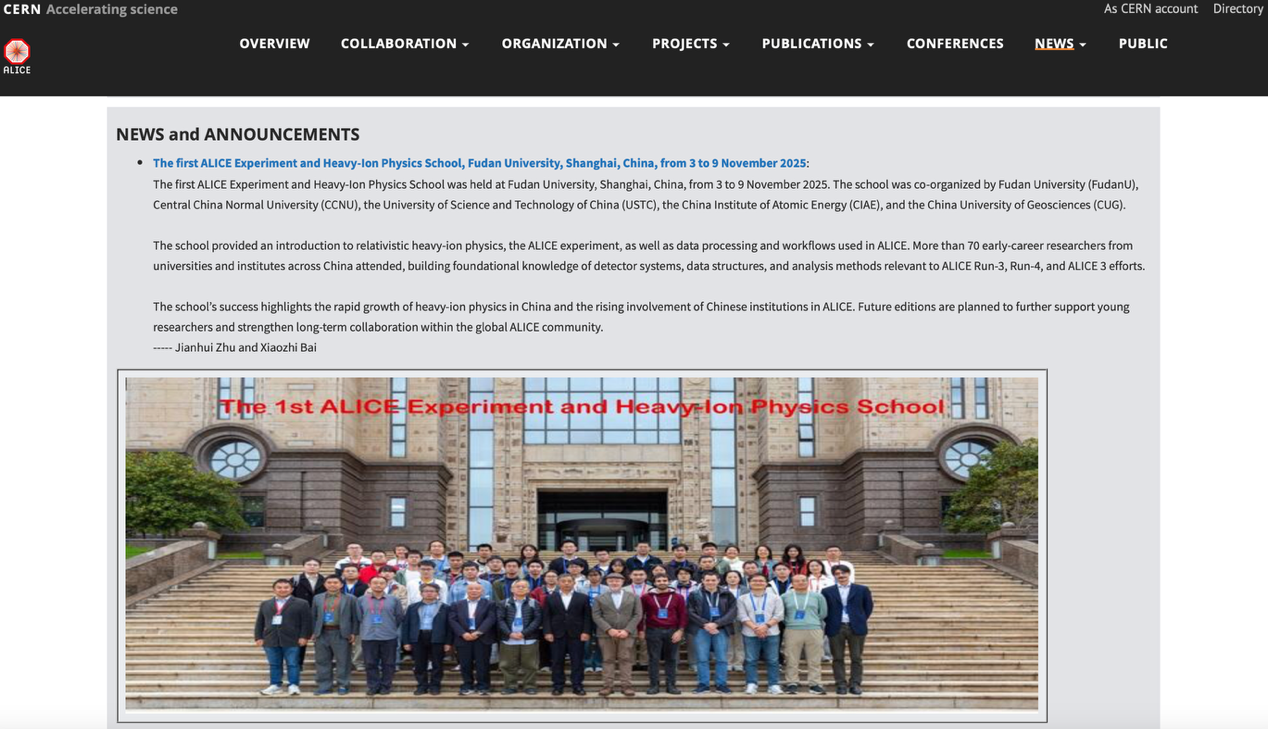 首届“ALICE实验与重离子碰撞物理”冬季讲习班于2025年11月3日至9日在复旦大学江湾校区现代物理研究所成功举办。本次讲习班由马余刚院士牵头发起,复旦大学主办、华中师范大学和ALICE中国组成员单位协办。ALICE实验的全称是A Large Ion Collider at CERN, 其目标是利用欧洲核子研究中心提供的世界上能量最高的重离子束流对撞模拟宇宙大爆炸初期的物质形态,并研究强相互作用性质及发现新的强子物质。在本次讲习班上,复旦大学现代物理研究所所长方德清教授和华中师范大学周代翠教授分别致开幕辞,对远道而来的国内外授课专家、青年学者和研究生表示热烈欢迎,并介绍了复旦大学和中国ALICE团队在重离子碰撞研究领域取得的成果及未来发展计划。ALICE国际合作组高度关注本次讲习班,并在官网(https://alice-collaboration.web.cern.ch/newsletter)进行了报道,彰显了我国在国际重离子物理研究中不断提升的影响力与重要地位。