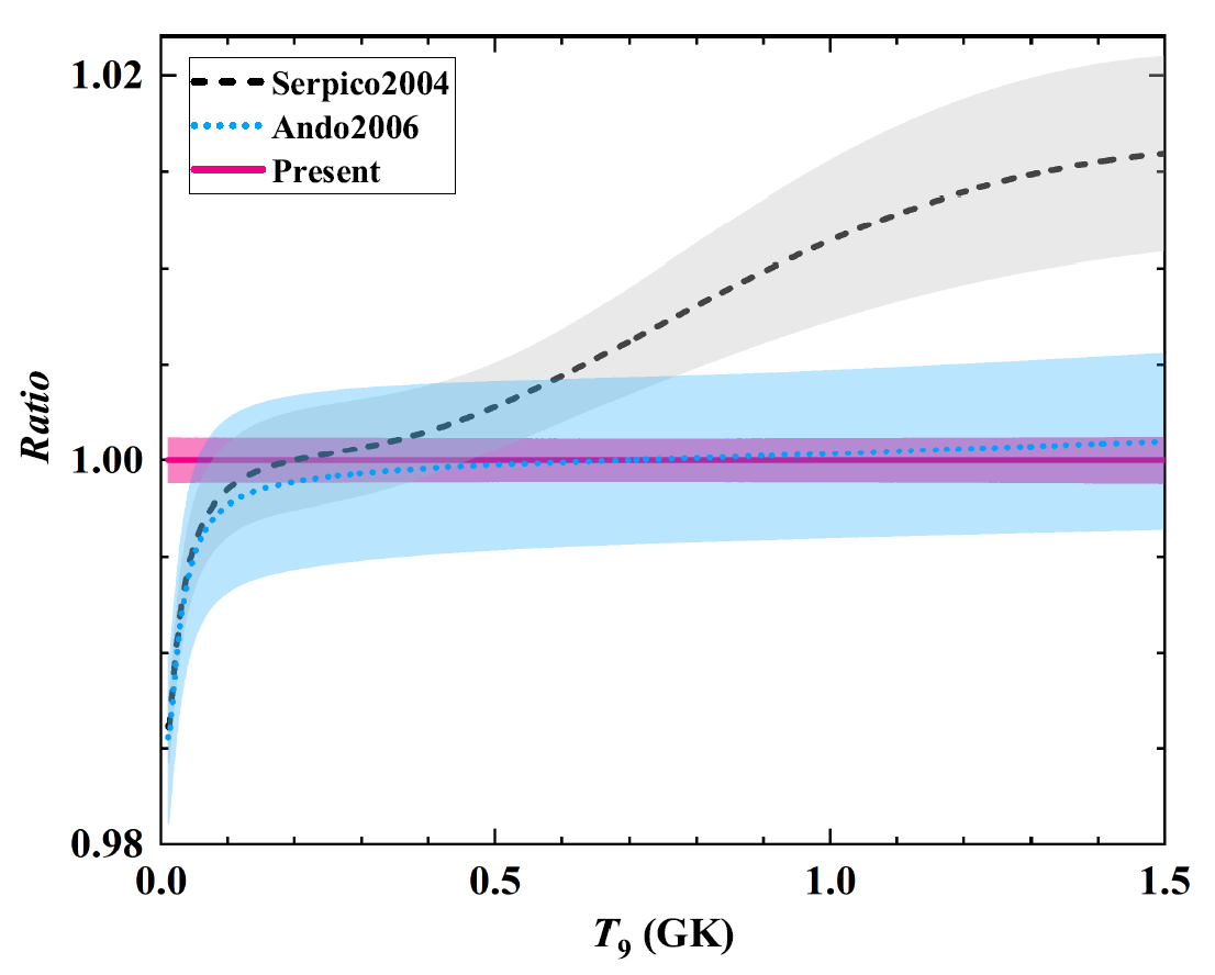 图3:本工作评估的p(n, γ)D反应率与之前结果的比较。带颜色的阴影表示不确定度。