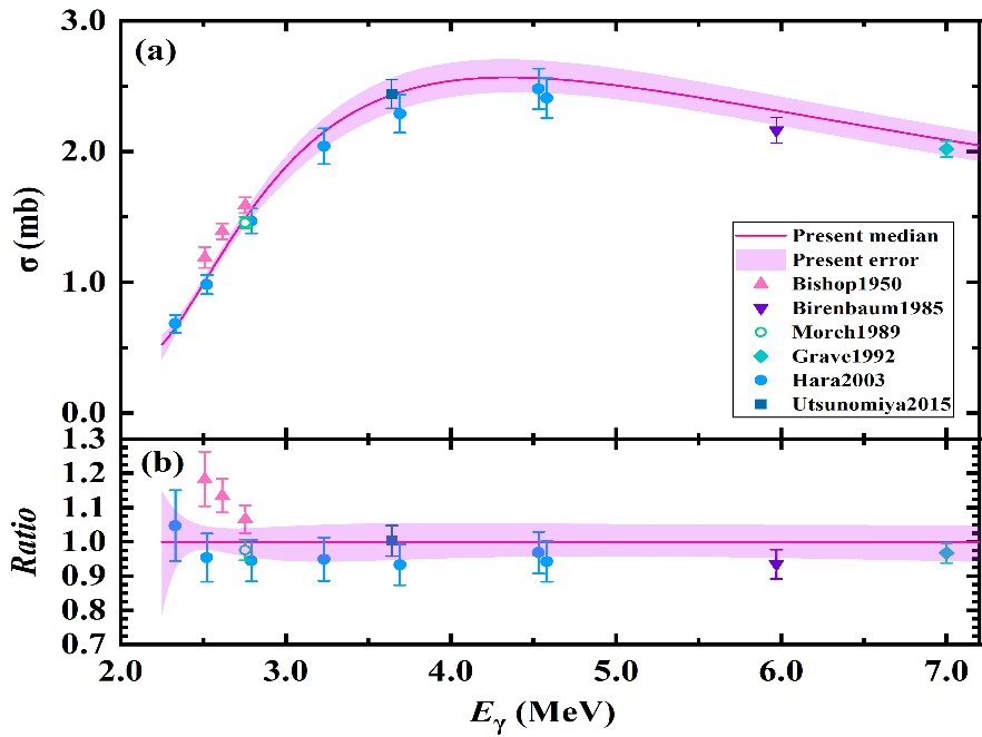 图2:D(γ, n)p反应的光中子截面。(a)基于SLEGS装置的结果以红线表示,不确定度以彩色带子表示。为便于比较,还展示了之前的数据;(b)本实验结果与之前的比较(以本实验结果作为参考)。