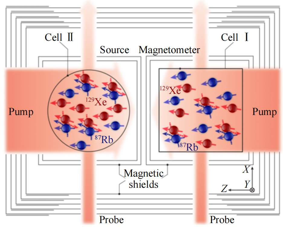 中国科学技术大学的研究团队利用惰性气体核自旋体系作为磁场量子探测器(图16),提出并实现了超灵敏极弱磁场探测。针对多种超越标准模型的自旋相互作用开展系统性搜寻实验,在观测窗口内将国际上探测界限提升至少17个数量级。