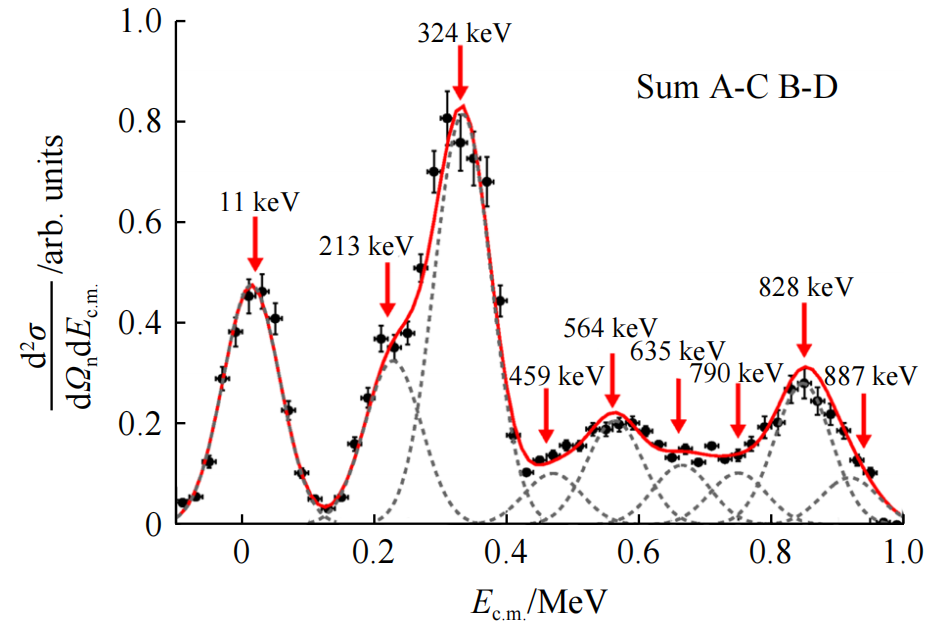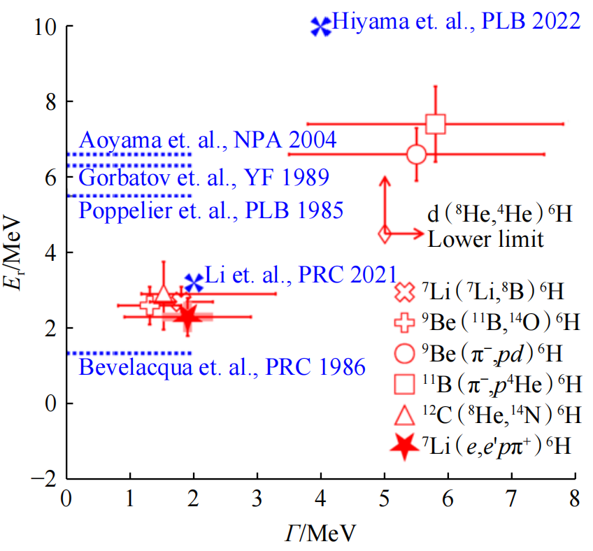 在丰中子核区,首次在电子散射实验中产生了丰中子氢同位素6H。复旦大学研究团队与国际团队获得了6H的缺失质量谱。在3H+n+n+n能量阈值之上观察到一个清晰的峰,得到6H基态能量为2.3±0.5(stat)±0.4(syst)MeV,宽度为1.9±1.0(stat)±0.4(syst)MeV(图4)。该工作对多核子相互作用的理解提出了新的挑战,并给出一种利用电子散射实验研究极丰中子轻核的新方法。
