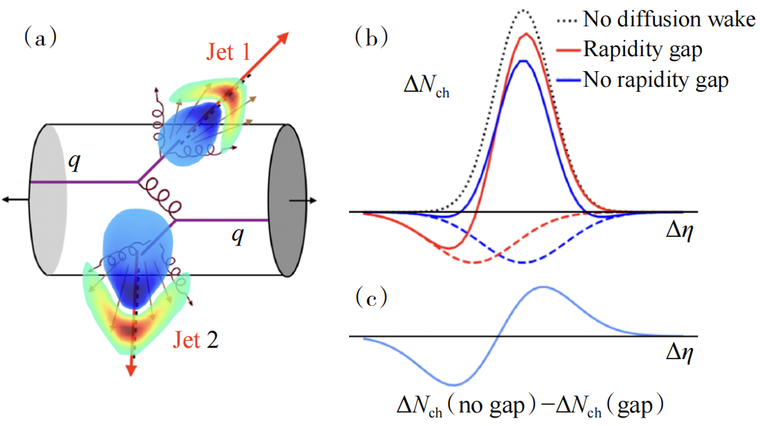 在喷注−强子关联方面,华中师范大学研究团队提出使用喷注−强子关联的快度不对称性作为双喷注中扩散尾迹的稳健且无背景的信号(图8)。这种不对称性出现是因为一个喷注的扩散尾迹相对于另一个喷注移动到了有限的快度。未来这种快度不对称性的测量可为喷注诱导的扩散尾迹和QGP的性质提供更精确的物理依据。